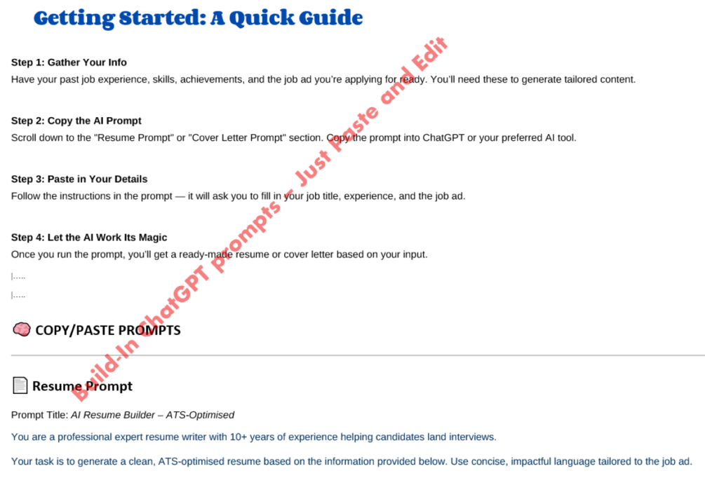 Create professional, ATS-optimised resumes and cover letters in minutes with ResumeGenie. This AI-powered toolkit includes proven ChatGPT prompts, formatting templates, and job-winning tips to help you land more interviews with less effort.